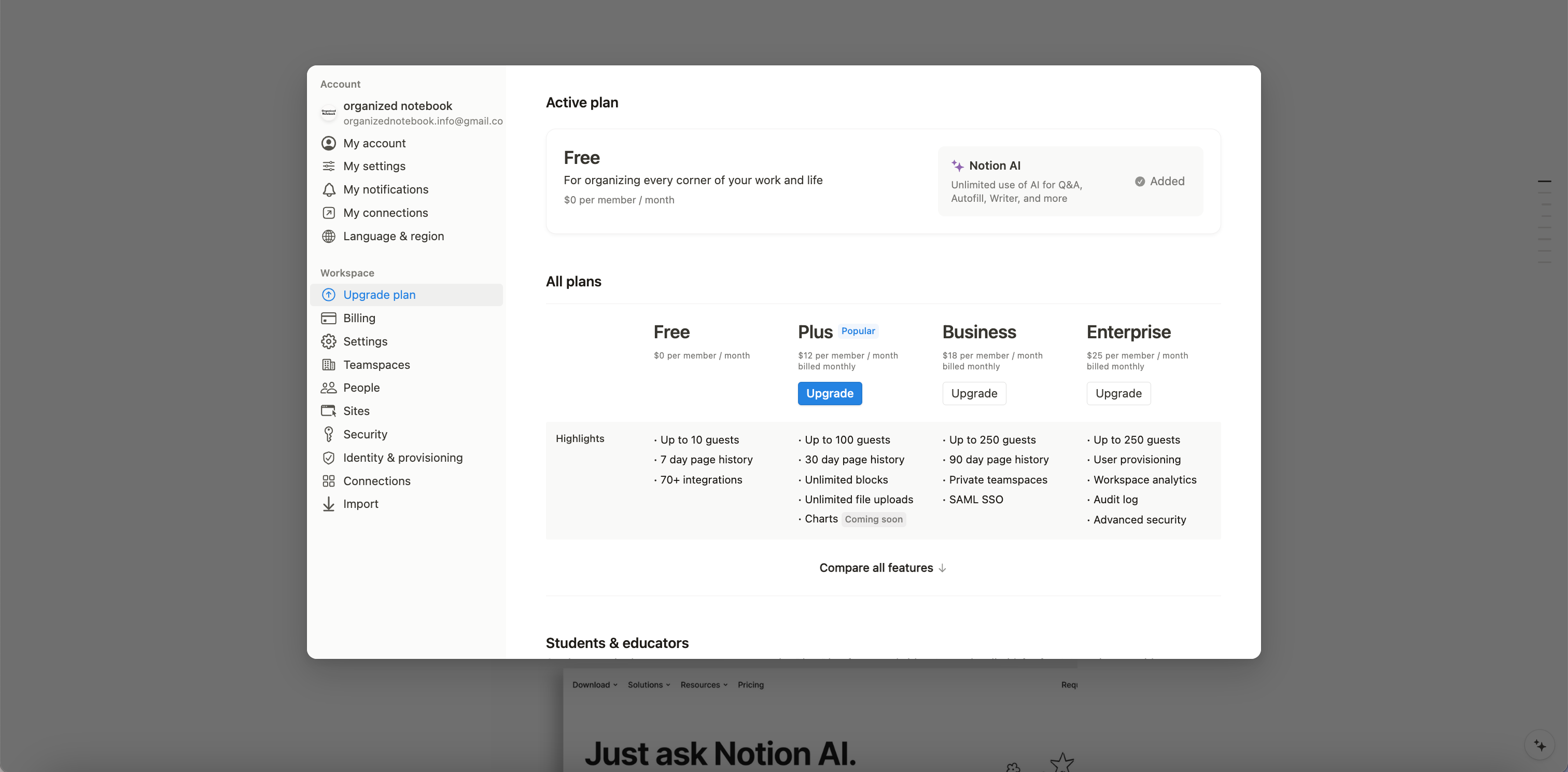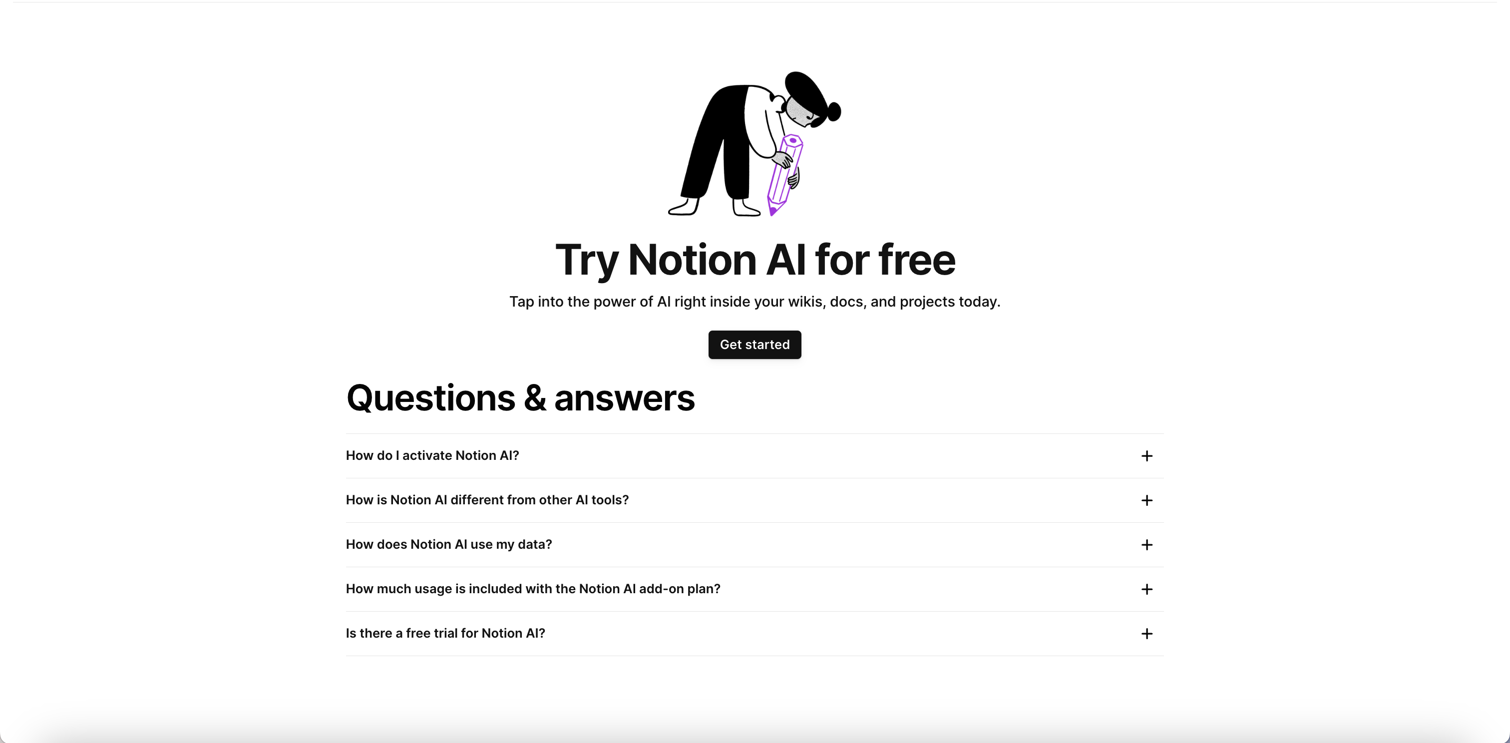 Notion AI gives out complimentary AI responses so everyone can assess its capabilities before purchasing a subscription. With more members, the number of free AI responses increases and is shared across the entire workspace.