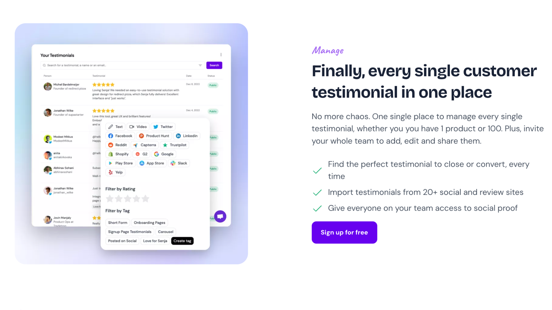 Manage all testimonials in once place