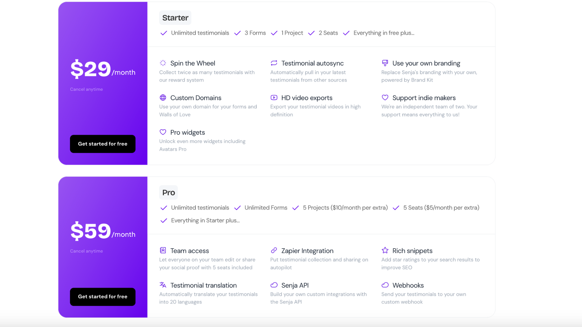 Pro Plan: Costs $29 per month, suitable for growing businesses needing more advanced features. This plan includes unlimited testimonials, integrations, and customization options.