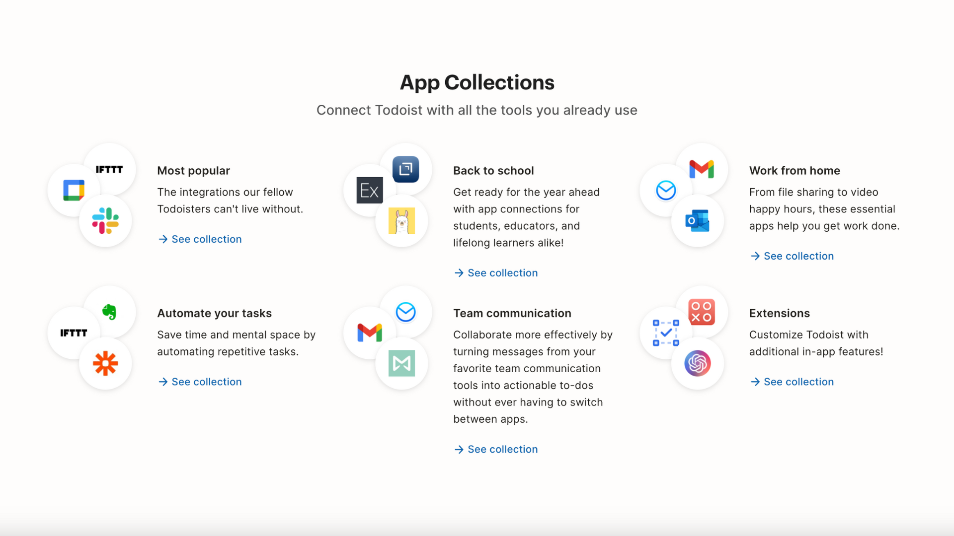It integrates with various other productivity apps such as Google Calendar, Slack, and Gmail, & Zapier.