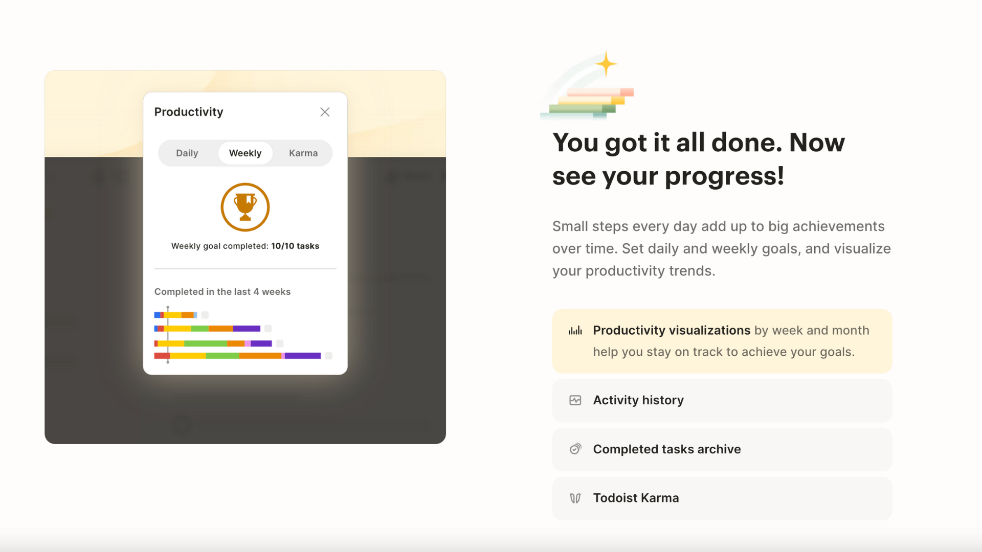 Todoist features a unique system, Karma, that awards points for completing tasks and using advanced features, which motivate users to stay productive.