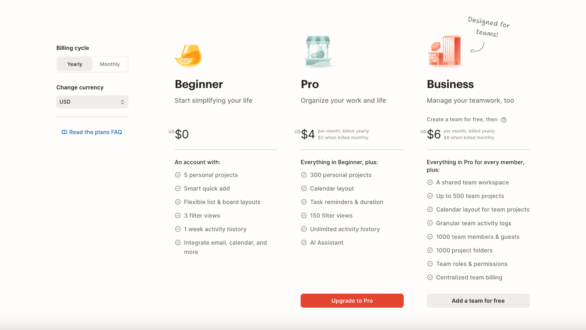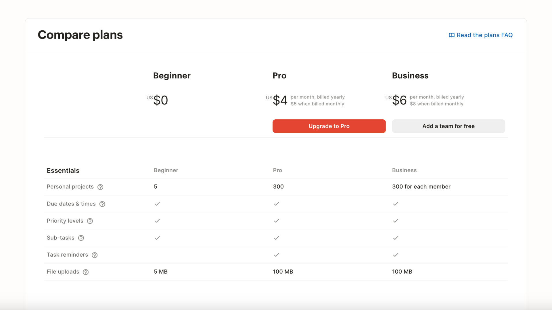 Todoist offers a range of pricing plans to suit different needs to help manage tasks efficiently, whether for personal use or team collaboration: