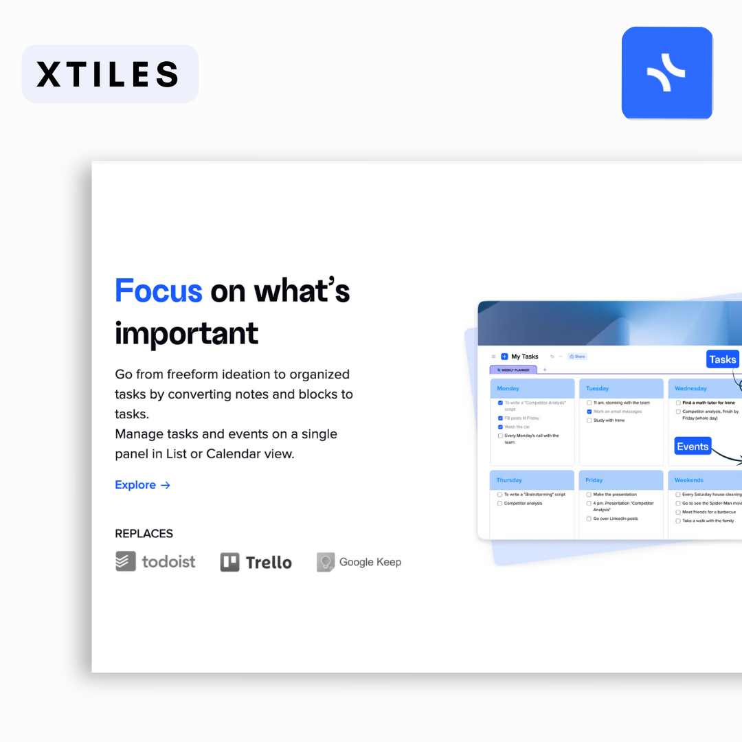 xTiles provides a platform for users to organize their tasks and notes. Compared with Notion, it's a powerful alternative for daily planning and management. This app lets you conveniently organize your thoughts, store ideas, and arrange your tasks into Kanban boards, calendars, and a variety of formattings.
