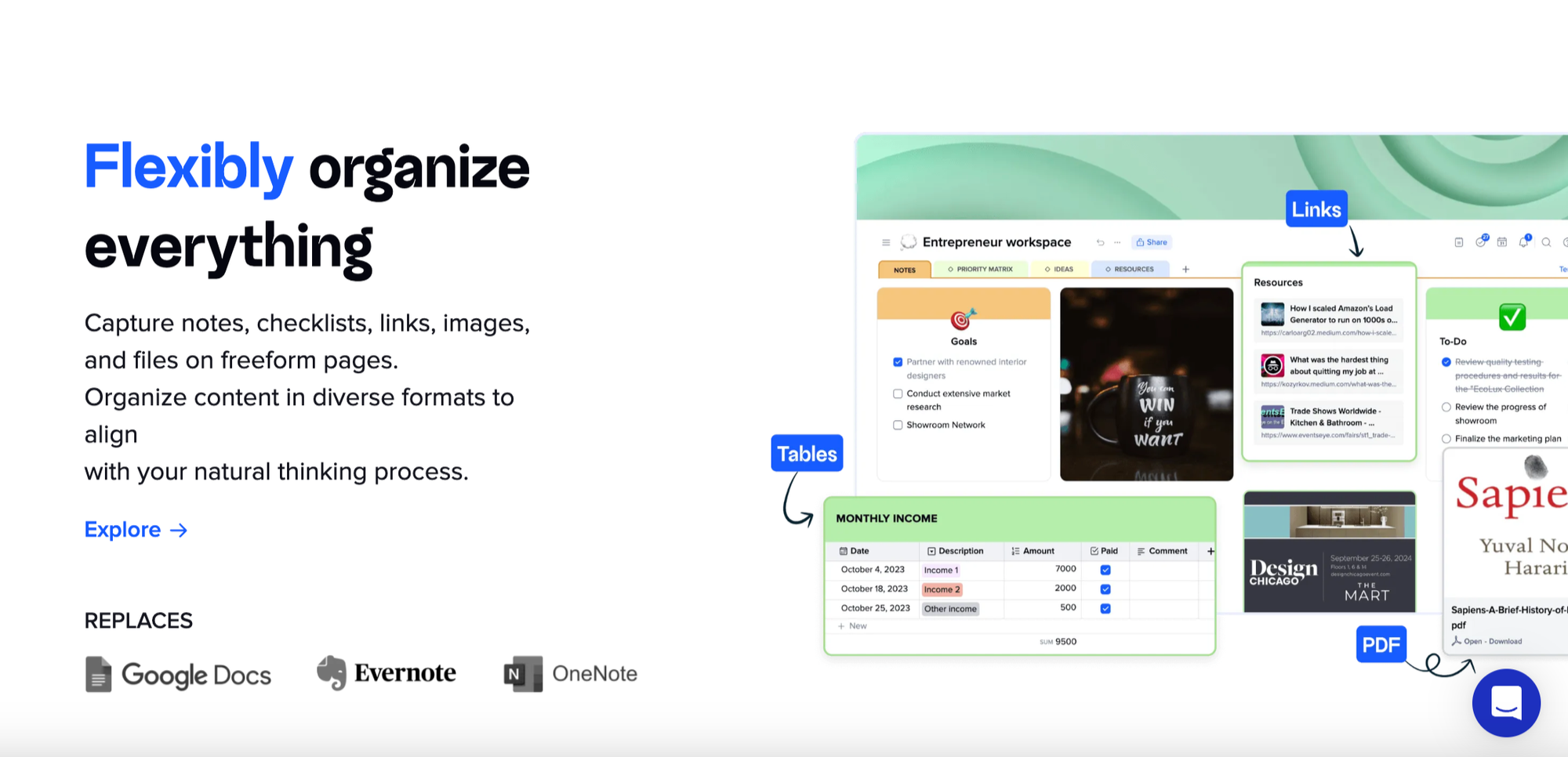 Store and organize notes, checklists, links, images, and files in diverse formats.