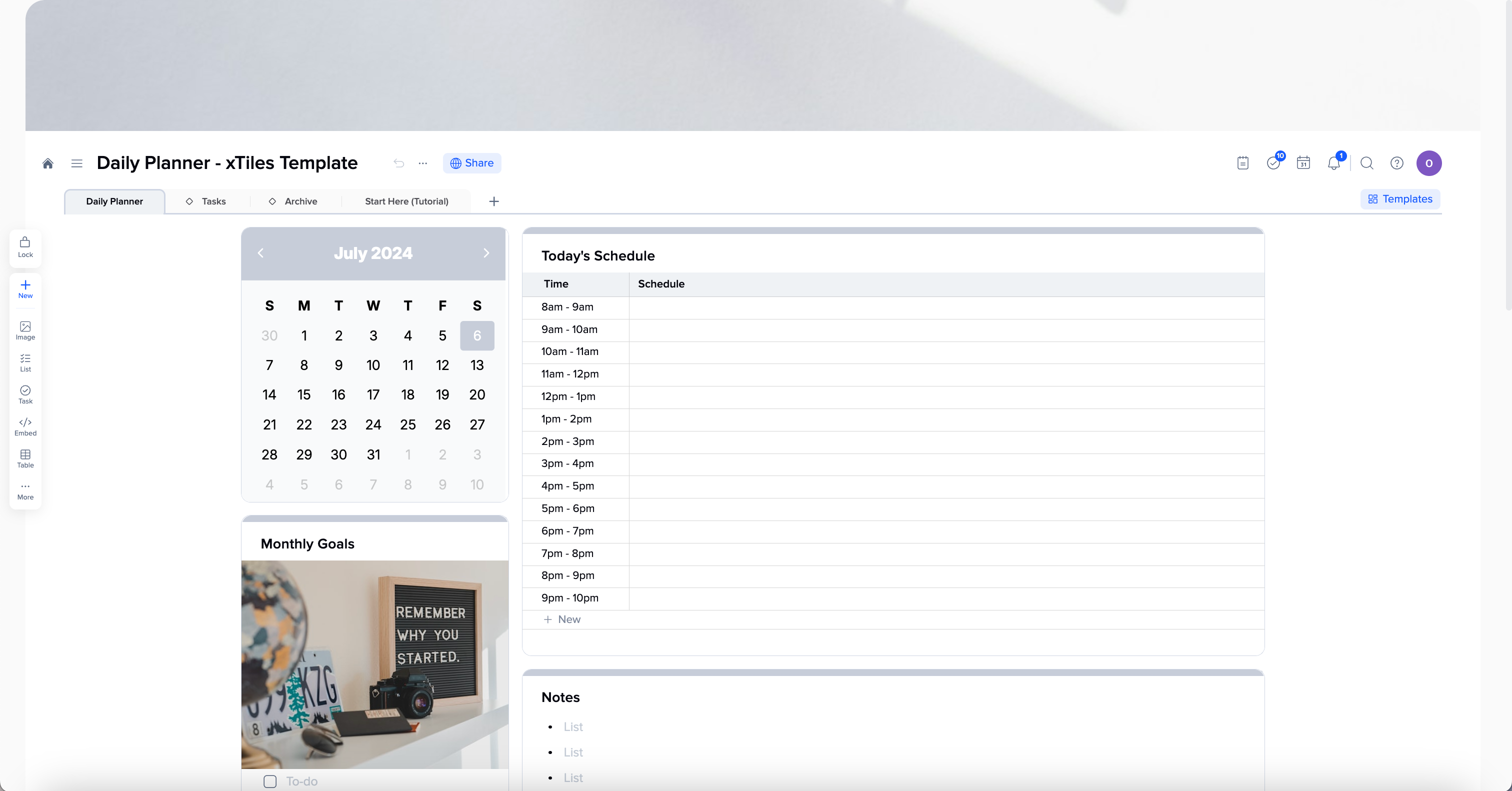 Xtiles is a great alternative for those who feel overwhelmed by Notion’s versatile customization. With a user-friendly interface, it is easy to create templates such as daily, weekly, and monthly planners, travel journals, mood boards, digital notebooks, and content planners.