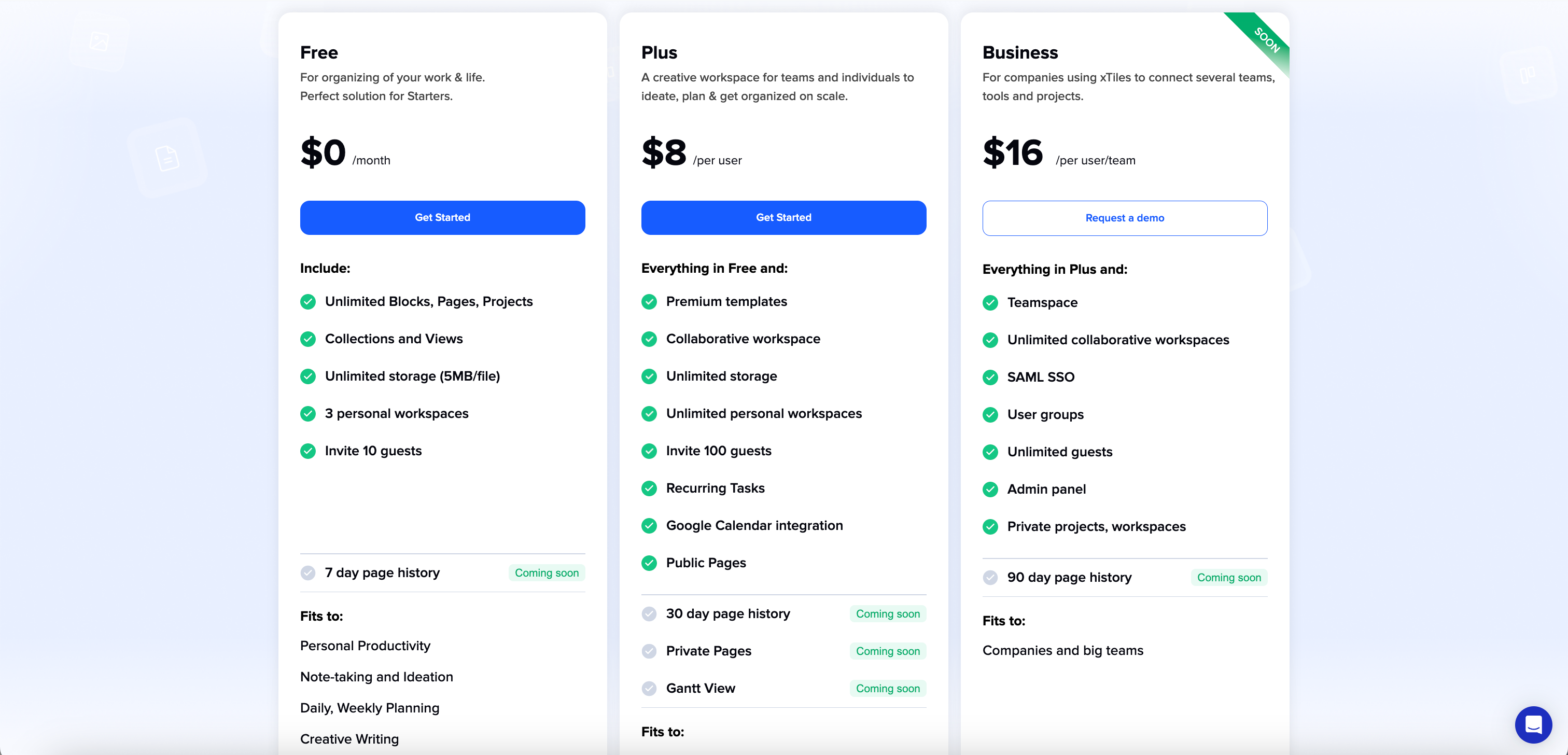 Plus: $8/user every month if you are in an annual plan. With this plan, you can have unlimited workspace, invite up to 100 guests, Google Integrations and public pages. This is highly recommended if you consider using xTiles for teamwork and projects.