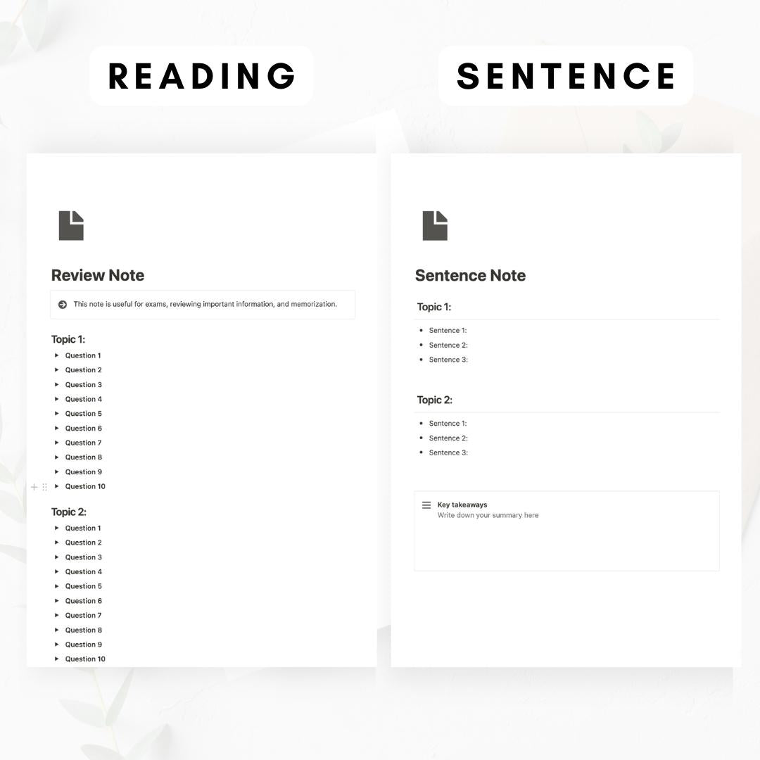 - 15 Types of Note-taking templates: 5W1H, Academic Journal Review, Boxing Note, Chart Note, Cornell Note, Review Note, Lecture Note, Meeting Note-Classic, Meeting Note-SOAP, Outline Note, Pros & Cons Note, Reading Note, Sentence Note, SWOT Note, SQ3R Note.
