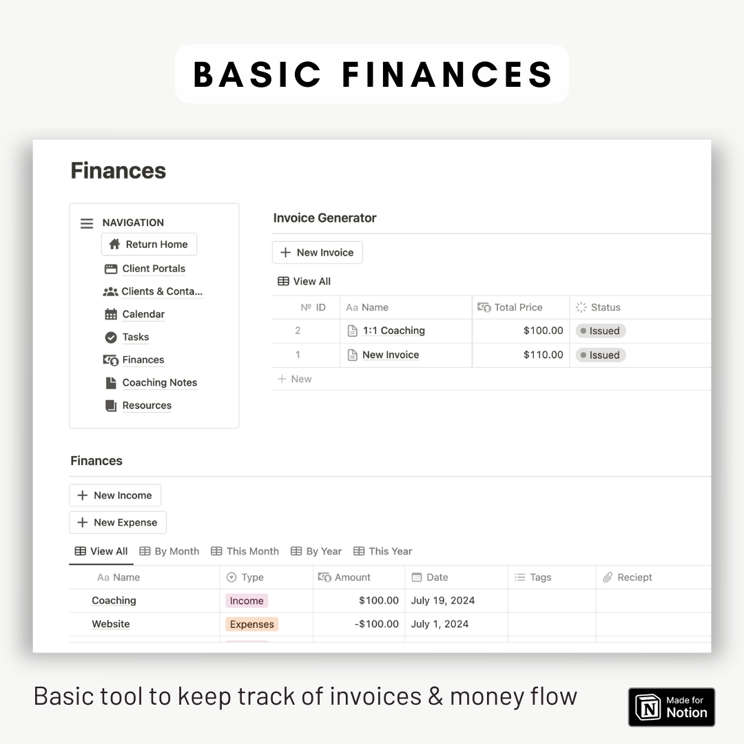 The template is great for any coach who's looking to organize their notes better, their tasks, and look more professional by offering their clients a clean portal. It's also great to use a starter kit and build more databases and functionality in it. Thank you so much!