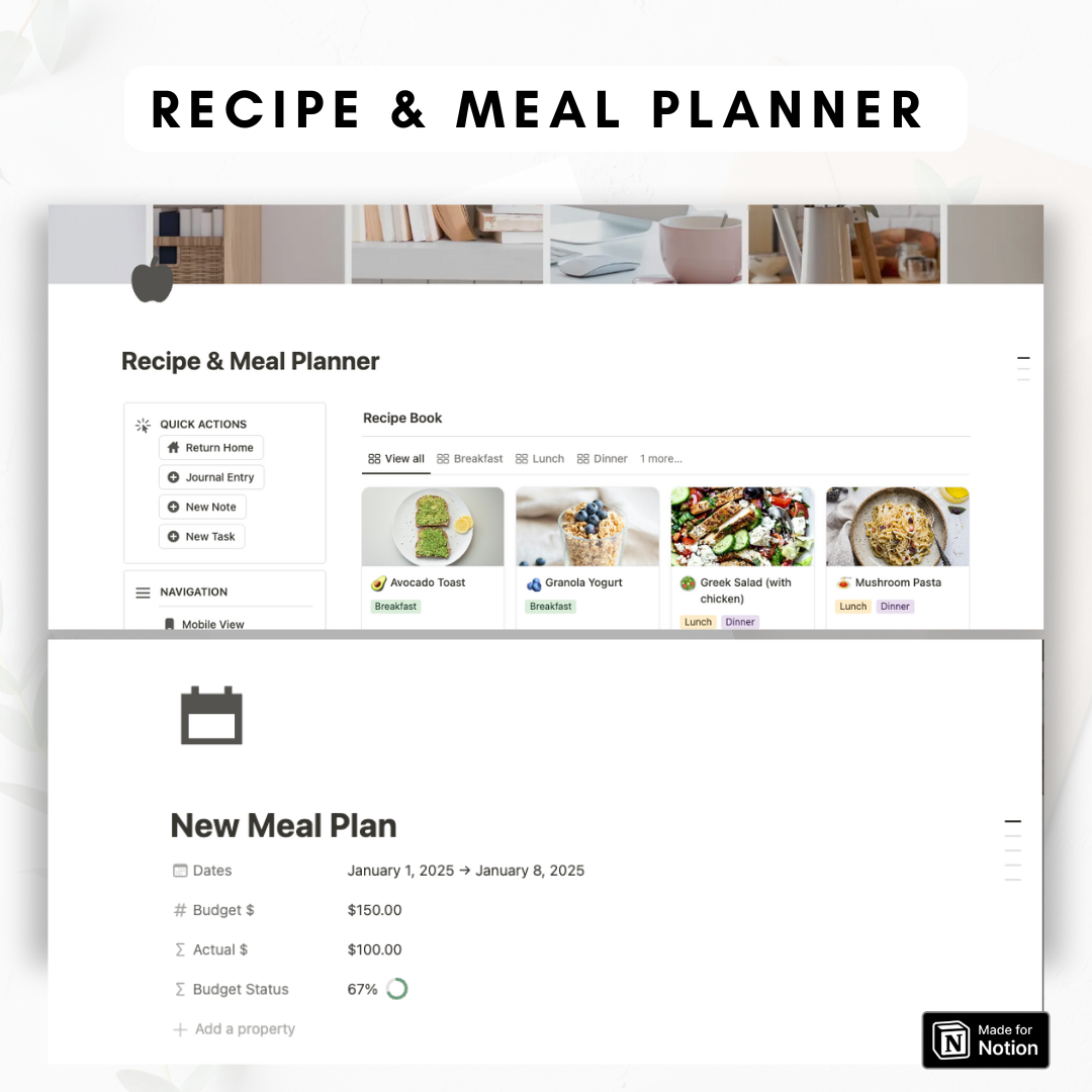- Recipe & Meal Planner: Plan your weekly meals, store your recipes, and see what ingredients you need to buy.