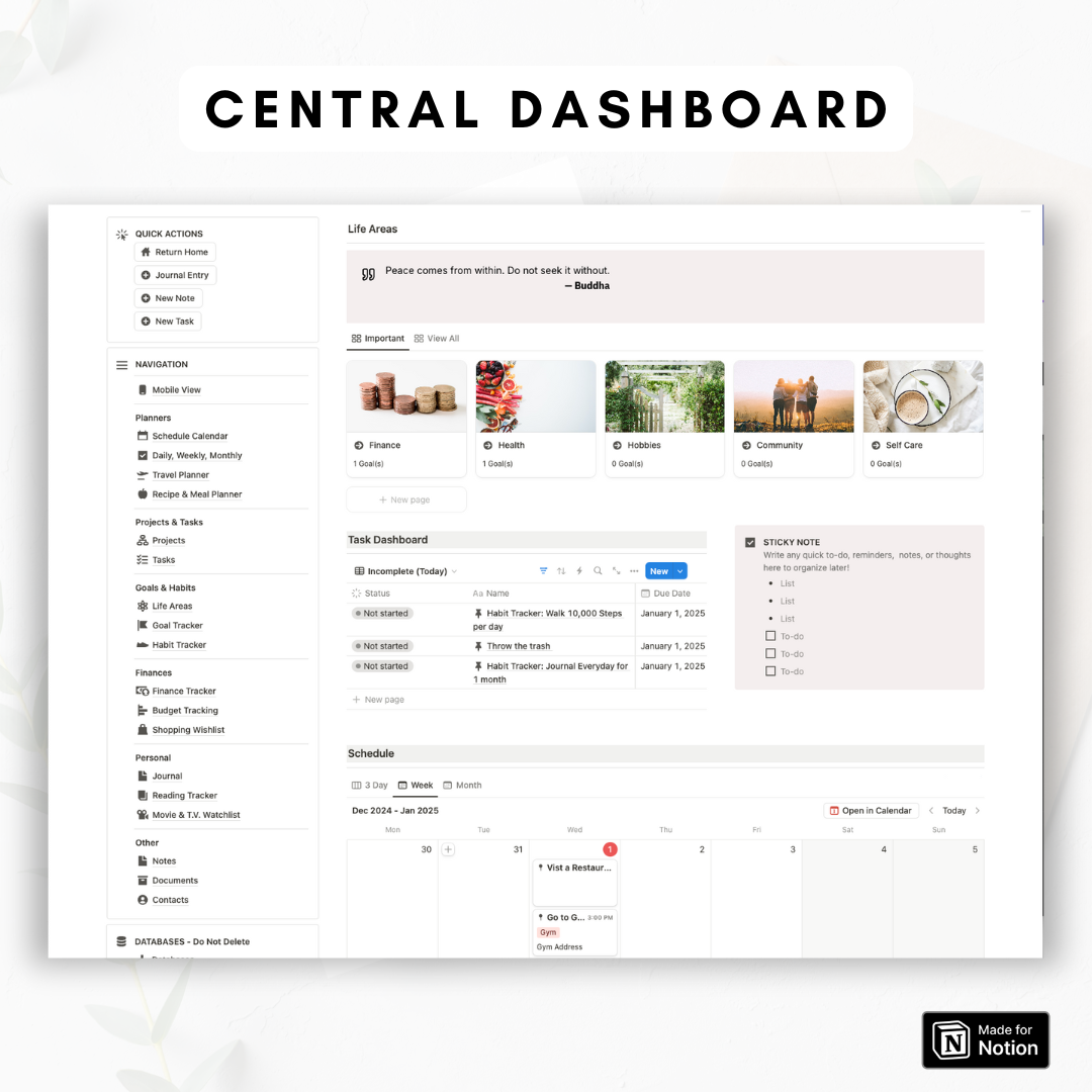 - Tasks: A centralized task system that connects with other areas of the life planner so that you won’t lose your task list. You can stay on top of everything from everyday tasks, habits, goal tasks, & more.